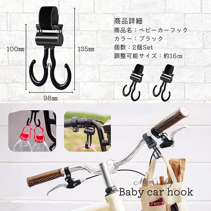 スタイリッシュなブラックカラーが魅力のベビーカーフック。強力なダブルフック設計で、荷物をしっかり支える安心仕様です。長さ約16cmの調整可能ベルトで、ベビーカーはもちろん自転車や買い物カートにも装着可能。耐久性に優れたABS素材を使用し、長期間の使用でも安定感をキープします。2個セットで使い勝手も抜群。育児やお出かけをより快適に、スマートにサポートする便利なアイテムです。