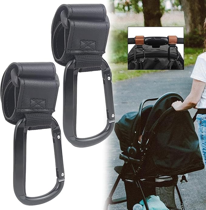 ベビーカー フック 耐荷重20kg 高級PU革 アルミ合金 滑り止め マジックテープ式 調整可能 簡単装着 ベビーカー/自転車/バイク用 ブラック 2個セット