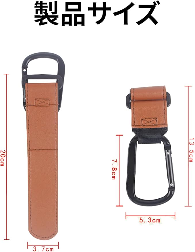 【材質】高級PUレザーと高強度アルミ合金製フックを採用したベビーカー荷物フック2個セット。耐摩耗性に優れ、最大耐荷重は約20kg。