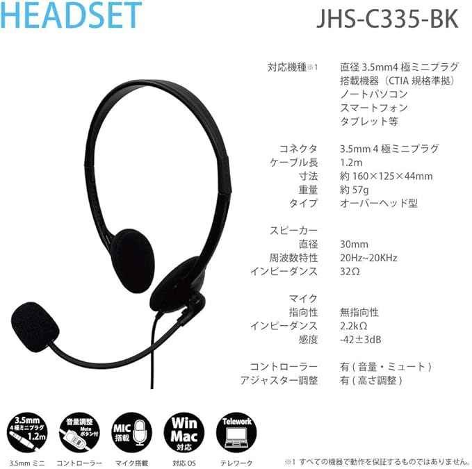 コンピュケースジャパン ヘッドセット マイク付き 軽量 4極ミニジャック 両耳 オーバーヘッド 1.2m テレワーク Web会議 JHS-C335-BK