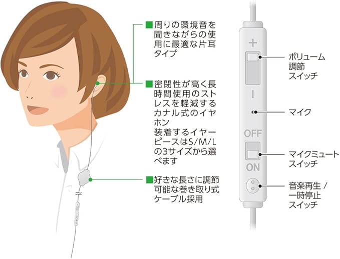 片耳タイプのため周囲の環境音を聞きながら使用できます。使用中に話しかけられても対応できるので仕事や作業をしながらでもご使用いただけます。手元コントローラーで操作可能