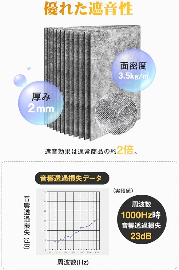 【厚み2mm】遮音効果が遮音シートの面密度に影響されます。厚みを2mmまで増やして面密度が3.5 kg/㎡に達したことで一般的な防音シートより、防音効果は倍増します。周波数1000Hz時の音響透過損失が23dBという抜群な遮音性能。また、電波障害(無線LANや携帯電話の不通)もありません。