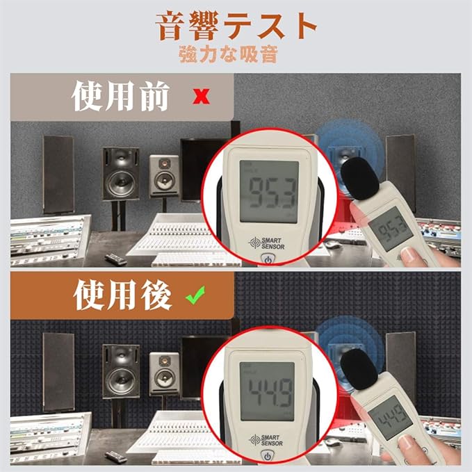 【高密度&抜群の吸音性能】弊社の吸音材は従来の吸音パネルに比べ、厚さは5センチに増えた。吸音パネルは厳密に最適化されたポリウレタン材質を採用し、25 kg/m の高密度極厚スポンジ。吸音シート防音効果がさらに高まります。吸音材の内部は多孔質となっております。ほかのと比べると、防音材パネルは厚さ5cm、25㎏/㎥という高密度の極厚スポンジを採用しており、厚手で、高反発で更に防音効率が倍増する。