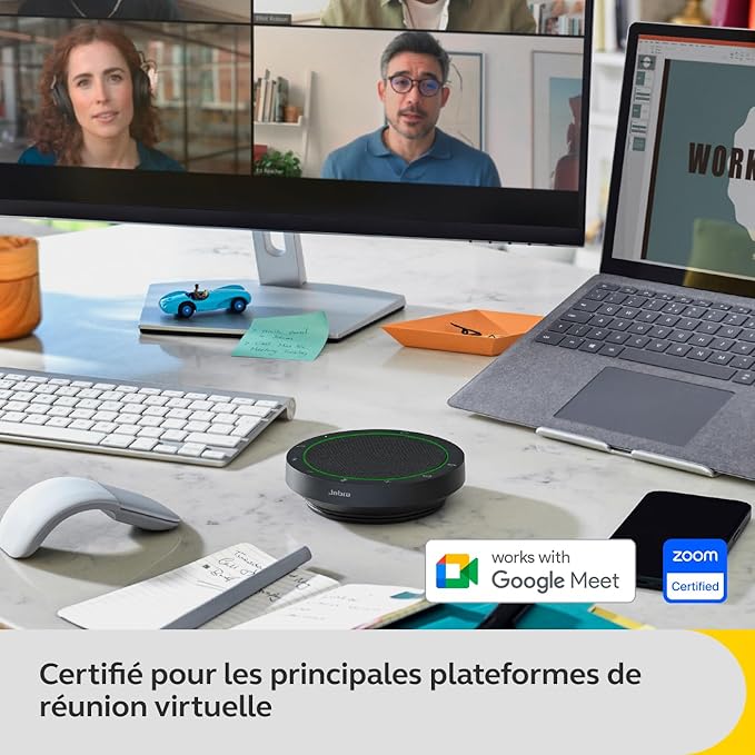 当社のポケットサイズのJabra Speak2 55スピーカーフォンは、ハイブリッド作業用に設計されています。 広帯域オーディオを備えた50mmフルレンジスピーカーは、どこにいてもパワフルなサウンドを提供します。 4つの超近代的なビームフォーミングマイクがあらゆる方向から音を拾います。ノイズキャンセリングテクノロジーがバックグラウンドノイズを除去し、クリアな会話を実現します。 全二重テクノロジーにより、対面での会話の自然な流れを維持します。 Speak2 55には最新の音声レベル正規化技術が採用されており、音声を自動的に同じ音量レベルに均等化し、誰もが自然に聞いたり話したりできます。 USB Cケーブル(USB Aアダプター付き)を介して会議スピーカーをコンピューターに接続するか、Bluetooth経由で携帯電話に接続します。 最大30mのワイヤレス範囲と12時間のバッテリー寿命により、シームレスにコラボレーションしながら自由に操作できます。 スピーカーは、ZoomやGoogle MeetなどのUnified Communicationsプラットフォームとも完全に互換性があります。 Speak2 55は耐水性と防塵性があり、2年間の保証が付いています。 Jabra。 人生の新しいリズムのためのテクノロジー。 何をしていようとも、私たちはあなたが仕事をするのを助ける技術を持っています。