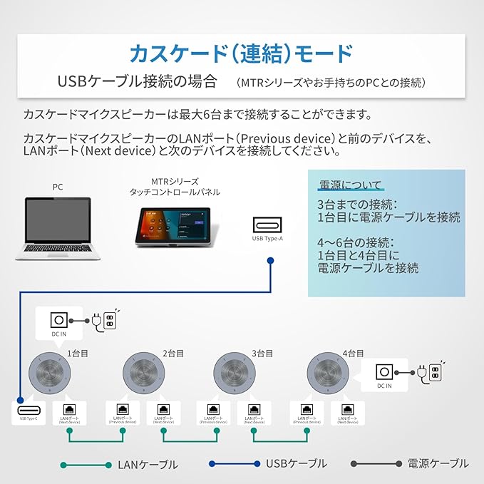PCをはじめ、MTRシリーズやタッチコントローラーのUSB-A端子とUSBケーブルで接続することで、マイクスピーカーとしてお使いいただけます。複数台の連結が可能なため、セミナールームや大会議室など20人以上が集まる空間にも対応できます。※電源コードの接続が必要となります。