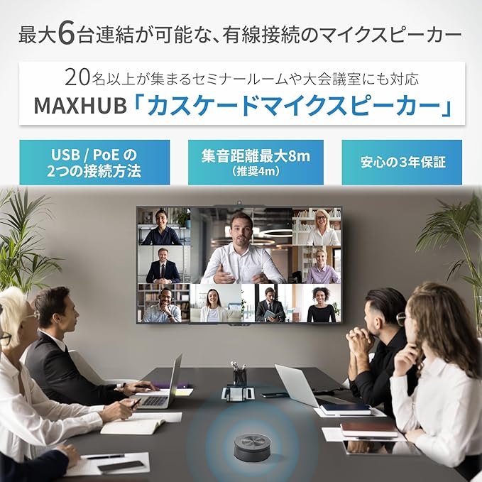 MAXHUB「カスケードマイクスピーカー」は、USB Type-C to AもしくはLANケーブルでの接続が可能な有線接続のマイクスピーカーです。集音距離は最大8m(推奨4m)でありながら、LANケーブルで本機を連結することで最大6台まで接続が可能なため、参加人数や会議室の広さに合わせて適切な台数をつなげることで、あらゆる広さの会議室でご活用いただけます。