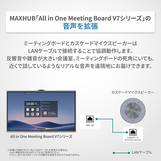 「All in One Meeting Board V7シリーズ」のMIC端子と本機のLANポートにLANケーブルで接続することで、V7のマイクスピーカーと本機が協調動作します。発言者の近くに配置することで、反響音や雑音が大きい会議室やミーティングボードの死角にいても、近くで話しているような、よりリアルな音声を遠隔地にお届けできます。