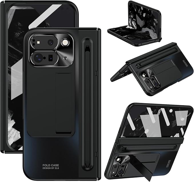 【Google Pixel 10 Pro Fold / 9 Pro Fold専用】多機能統合型 ケース 全面保護+強化ガラスフィルム+きんぞくラッカ+ペン 隠しスタンド機能 ヒンジ保護 ワイヤレス充電サポート 手帳型 携帯カバー 薄型 軽量 キラキラ 衝撃吸収 指紋防止 面白い 個性 二層構造 Beautycatcher - 黒