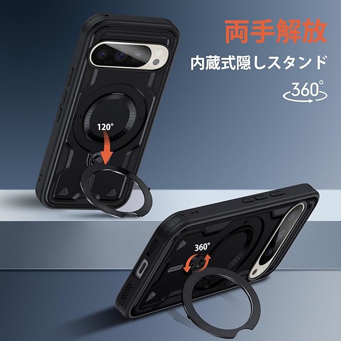 スタンド機能:嵌め込み構造により、しっかり本体を支え揺れなし。マグネット式車載ホルダーに対応して。ケースを横置きにするとスタンド機能になり、持たず動画鑑賞などを楽しむことができます。リングはケースにしっかり固定されていて、縦置き、横置きどんな角度でも固定できます。