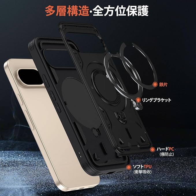 Google Pixel 10 / 10 Pro 対応 ケース リング付き レンズ保護 耐衝撃 スタンド機能 カバー PC+TPUバンパー レンズ保護 車載ホルダー ワイヤレス充電 ストラップホール付き 指紋防止 黄ばみなし 薄型 滑り止め 擦り傷防止 耐久 スマホケース ピクセル10 / 10 プロ 対応 携帯カバー 黒 SJ10.61
