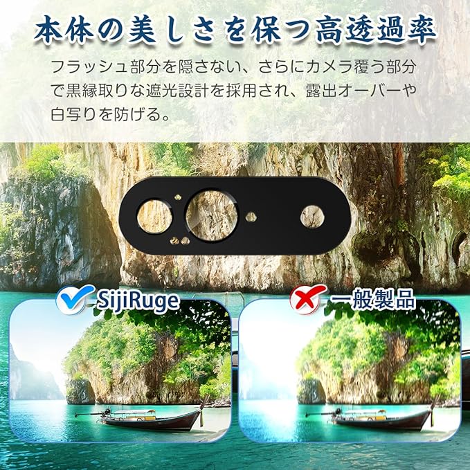 【装着感ゼロ】フィルム全周はアルミ合金製リングとの融合で、本体のお洒落を向上しながら。貼っていることを忘れるほどの薄さ0.3mmで、ケースにも干渉しません。フラッシュ部分を隠さない、さらにカメラ覆う部分で黒縁取りな遮光設計を採用され、露出オーバーや白写りを防げる。透過率は99%超えて高い透明度を維持していて、画像や映像を色鮮やかに映し。