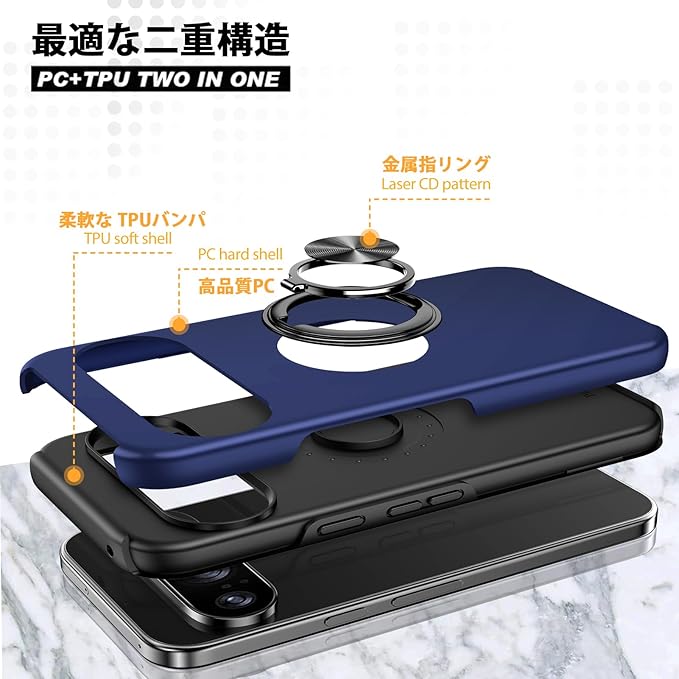 【リング付き・スタンド機能】後ろで嵌め込み式リング付き、伝統的なリングと比較して、アイフォーンの水平安定性を維持することができます。ケースを横向きにするとスタンド機能になり、360度回転と120度調節可能です。マグネット対応金属板採用し、車載ホルダーに強く吸着することもできます。