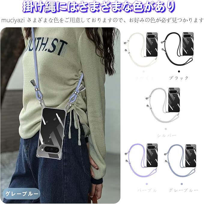 Google Pixel 10/Pixel 10 Pro 用 ケース クリア ショルダー ピクセル10 カバー 肩掛け 斜めかけ 縄掛けケース 透明 薄型 軽量 TPU 携帯ケース 紐付き 織りストラップ付き 長さ調整可能 取り外し可能 落下防止 紛失防止(グレーブルー)