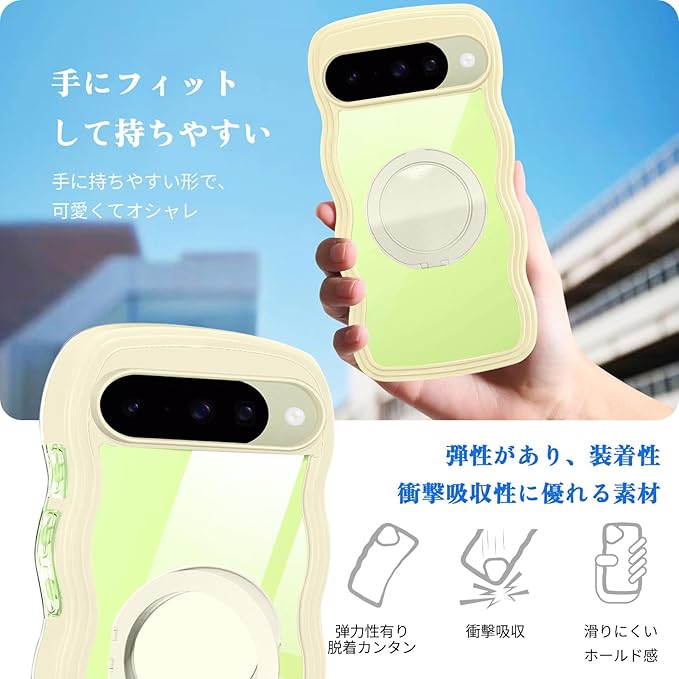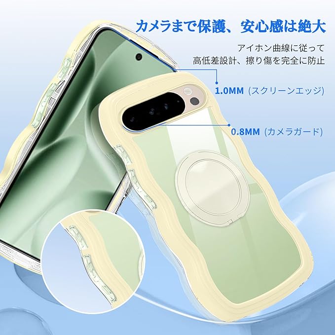 Google Pixel 10 用 ケース リング クリア ピクセル10 pro カバー スマホケース 透明 背面ケース 可愛い 耐衝撃 ストラップホール付き 波型 黄 韓国 人気 イエロー