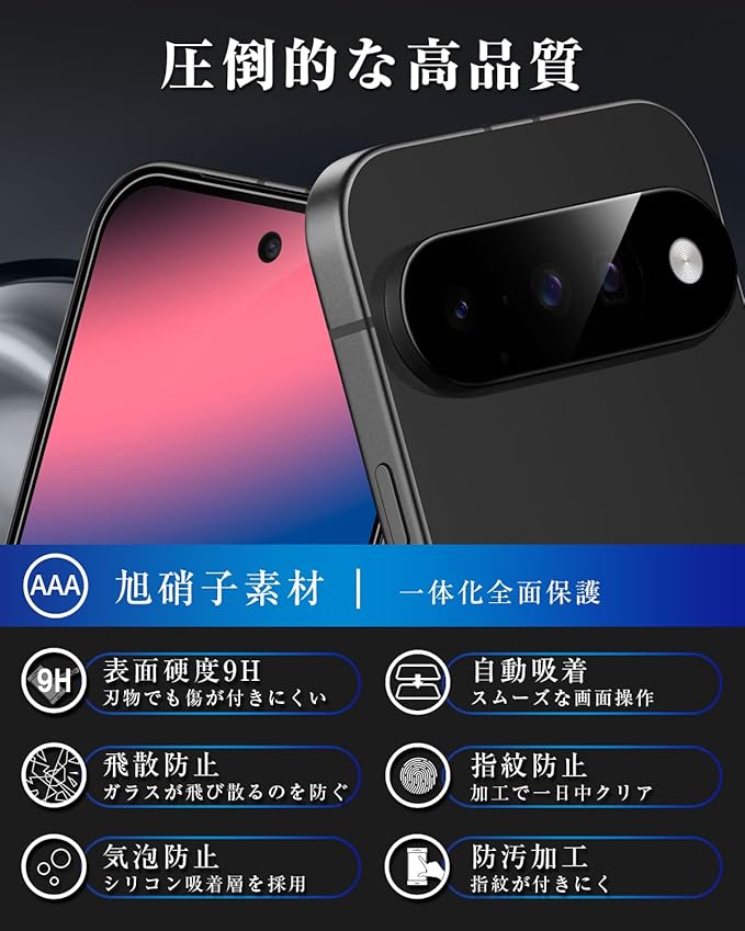 【超高品質素材】対応 Google Pixel 10 カメラフィルムは日本旭硝子製の強化ガラスを採用し、9Hの超高硬度を持っています。ハードコーティング技術により外部からの衝撃をフィルムが吸収し、画面へのダメージを最小限に抑えます。ナイフや鍵などの鋭いものでも簡単に傷がつきません。万が一カメラフィルムが破損した場合でも、ガラス片が飛散しないよう飛散防止処理が施されています。