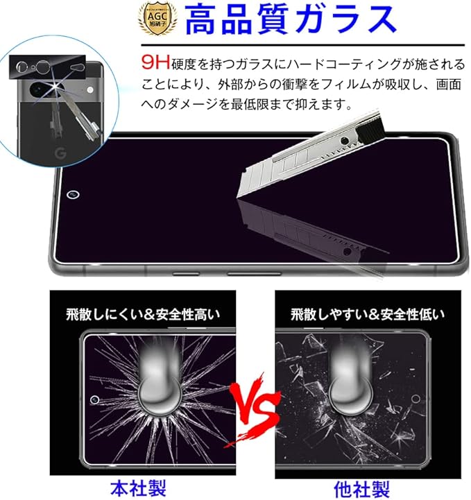 【高品質ガラス】日本旭硝子製ガラス素材を使用しており、9Hの表面硬度を誇る保護フィルムです。通常のPETフィルムより4倍の強度、鍵やカッターなどの鋭利な物を当てても損傷なく使用する事が可能で、摩擦や傷から液晶ガラスをしっかり保護します。万が一強力な衝撃でガラスフィルムが割れてしまっても、破片の飛び散りを防ぐ飛散防止コート処理で、画面をしっかり保護、スマホ本体と共に手の怪我の心配もありません。二重の保護で日常生活では、スマホを落としたり衝撃を受けたりした時に、保護フィルムがあれば、画面やレンズの破損を気にすることなく、しっかりと保護することができます。
