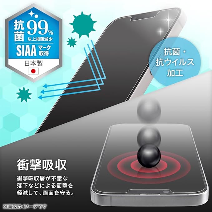 割れにくく、しなやかなPET素材を使用したブルーライトカット反射防止フィルム。 上下で順番に貼れるので、位置合わせがしやすく、貼り付けもスムーズです。 さらさらとしたマットな表面で、指紋が目立ちにくく、衝撃吸収層で安心感をプラス。 ブルーライトカット率は約40%で、目の疲れを軽減します。 抗菌・抗ウイルス加工が施されており、清潔さを保ちたい方にもおすすめです。