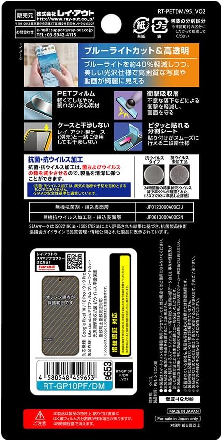 割れにくく、しなやかなPET素材を使用したブルーライトカット光沢フィルム。 上下で順番に貼れるので、位置合わせがしやすく、貼り付けもスムーズです。 画面のきれいさをそのまま楽しめる光沢仕上げに加え、衝撃吸収層で安心感をプラス。 ブルーライトカット率は約40%で、目の疲れを軽減します。 抗菌・抗ウイルス加工が施されており、清潔さを保ちたい方にもおすすめです。