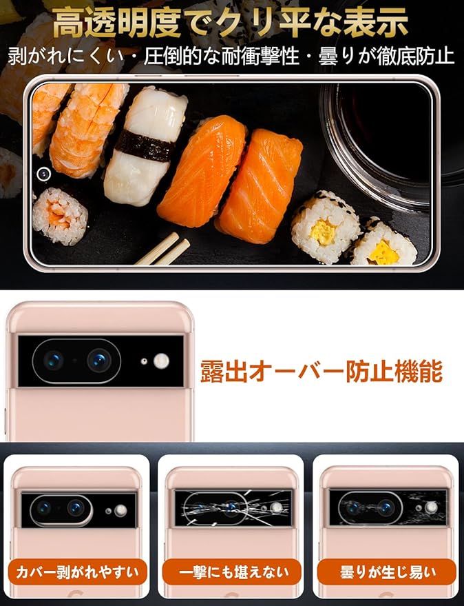 【超安全性・飛散防止】この グーグルピクセル8 液晶保護ガラスは業界最高レベルの硬さ9H+を使っており、4.5時間以上の高温処理加工しておりますので、ガラスフィルムは通常のガラスの硬さの5倍に達しました。かぎやナイフなどの鋭いものに触れても傷しにくいです。更にガラスの表面に防爆PET層を増やして、衝撃されても割れたら飛散しなく、ユーザー様の身の安全を守ります。あなたの大切な携帯電話のカメラ画面を衝撃や傷から守る。