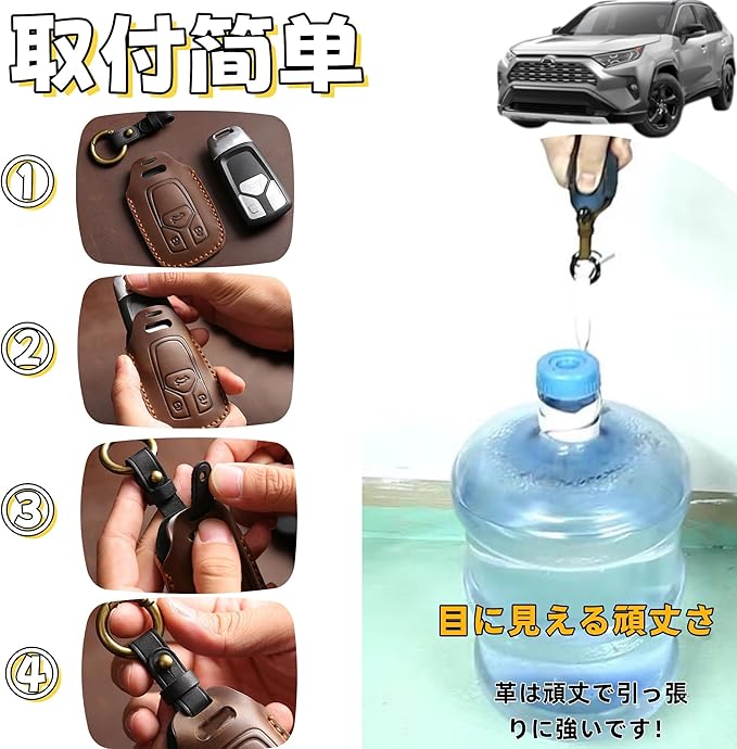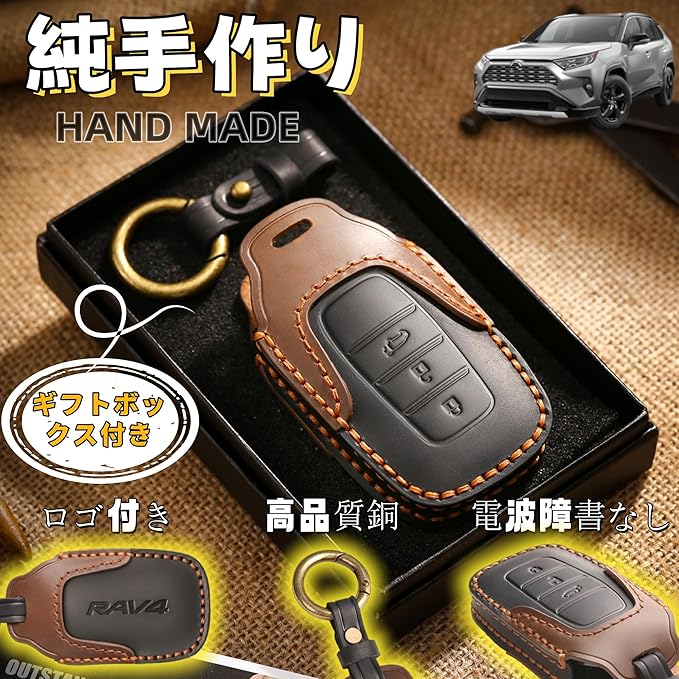 【対応車種】新型RAV4 50系2ボタン/3ボタン。本革製作厳選された輸入一層目のカーフレザーを使用し、職人の手による丁寧な手縫い仕上げ。プラスチック不使用で、異臭もなく、防湿効果もあります。傷防止本革製のため、表面に傷がついても指で揉むだけで元に戻ります。傷を気にせずお使いいただけます。二重バックル設計専用設計の二重バックルを採用し、鍵の紛失をしっかり防ぎます。ギフトボックス付き同級生、友人、恋人、家族への贈り物に最適なギフトボックス付きです。大切な方への特別なプレゼントにどうぞ。 "