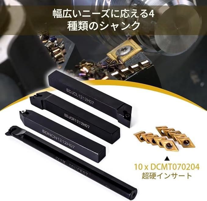 zmart DCMT070204 超硬インサート 10個+ 12ミリメートルボーリングバーツールホルダー4個+レンチ4個 旋盤 用 旋削工具 超硬 インサート チップ 切削工具 旋盤 フライス 研削 耐摩耗性 耐熱性 工具寿命 加工精度 セラミック チタンコーティング コーティングチップ 刃先 旋削 ミーリング 加工速度 切削性能 工具ホルダー