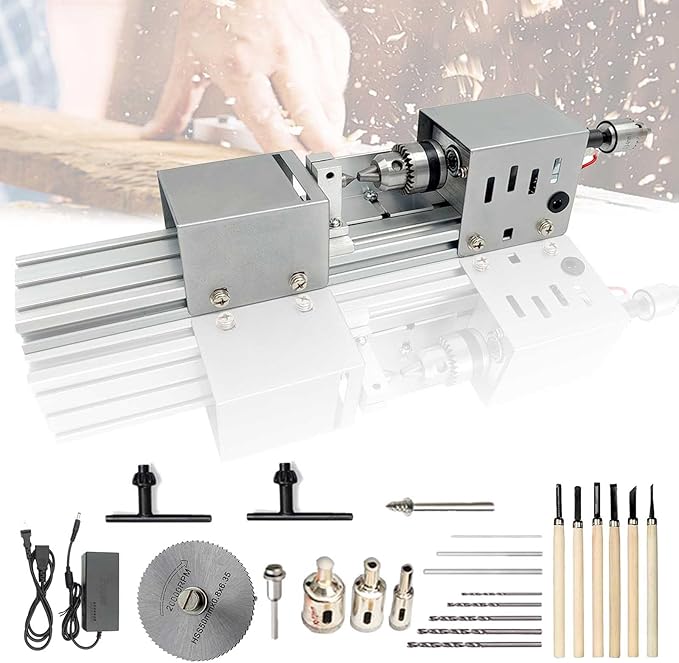 【シルバー/両頭グラインダー 商品一覧】旋盤*1個(付回転チャック 2)、7速電源アダプター*1個、ドリルチャックキー*2個、ネジ式固定ピン*1個、六角仏壇固定ピン*3個、ツイストドリル*5、丸めヘッド*3(12/18/22)、小鋸刃*1、、彫刻刀6本セット*1個(適用木材:松材。 シカモア材)