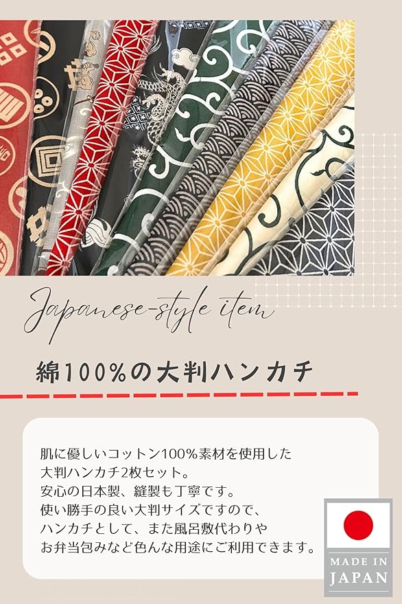 ✅【デザインと用途】日本古来の吉祥文様や伝統的絵柄をプリントしています。普段使いのハンカチとしてはもちろん、着物や浴衣など和装にぴったりの使い勝手の良いデザインとなっています。 またハンカチとしてだけではなく、お弁当包みや、ミニ風呂敷として、バンダナ、柴犬などワンちゃんやペットのおしゃれなど多用途にお使いいただけます。
