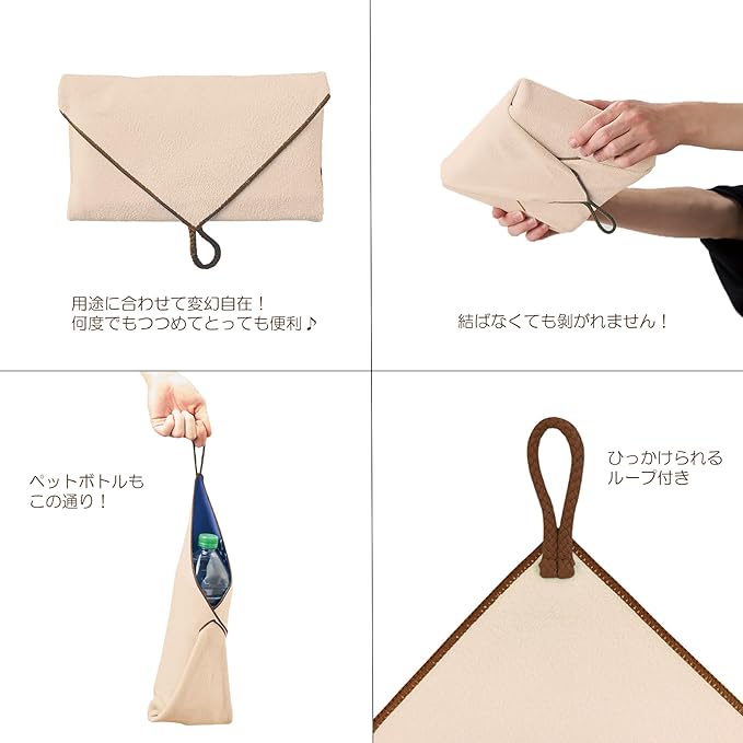 表と裏がマジックテープのようにぺたぺたとくっつく素材になっていて、お弁当を包んだり、濡れたペットボトルを包んだり、雨の日の折りたたみ傘も包み込みます ポーチのように使うこともできて様々な用途でご使用いただけます。 ループが付いているのでフックなどにかけることもできます♪