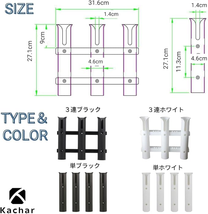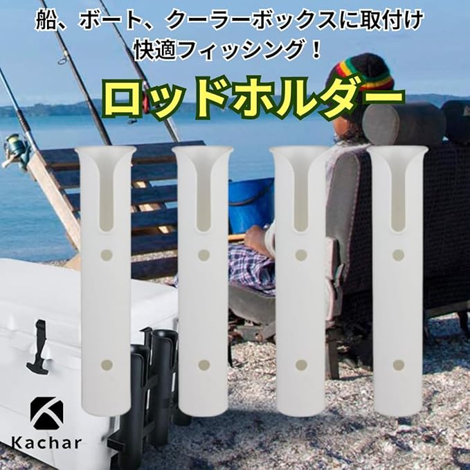 【仕様・サイズ詳細】ロッドホルダー:4本セット サイズ:縦約27.1cm カラー:ホワイト/ブラック。釣り竿ホルダーとしてだけでなく、ルアーや小物の仮置きにも活用できるマルチなフィッシングアクセサリーです。
