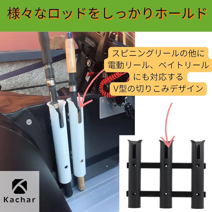 【幅広いリールに対応】スピニングリール、電動リール、ベイトリールなど様々な種類のリールに対応する設計。V型の切り欠き構造が竿を安定してホールドし、不意の転倒や落下を防止します。ルアーフィッシングから餌釣りまで幅広く対応できるため、初心者からベテランまで幅広い釣り人におすすめです。