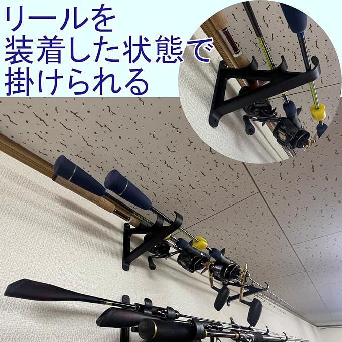 少ないスペースを有効活用して横掛けタイプのロッドスタンドです。リールを装着した状態で掛けられます。