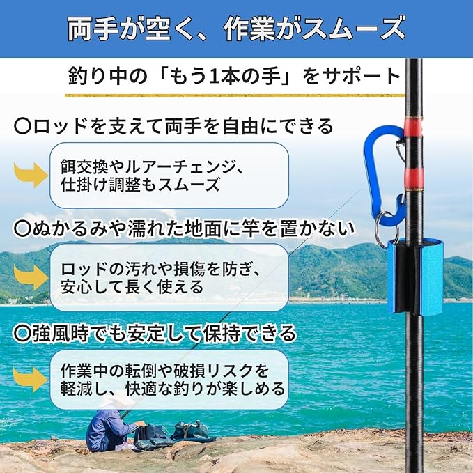 【両手を自由に使える便利なロッドホルダー】釣り竿をしっかり固定し、両手を自由に使えるカラビナ付きロッドホルダーです。餌の交換やルアーチェンジ、糸が絡んだ時、魚を外す時など、作業中にロッドを地面に置かずに安定保持できます。EVA素材のホールド部がしっかりと竿を支え、滑りにくい構造で安定性を確保できます。そのため、強風や波のある環境下でもロッドが倒れにくく、汚れや水濡れを防止します。渓流釣りや堤防釣り、管理釣り場など幅広い釣行シーンで活躍します。地面が濡れていたり砂浜が柔らかい場所でも、ロッドを宙に保持できるため、タックルを清潔に保ちながら作業効率を高められます。