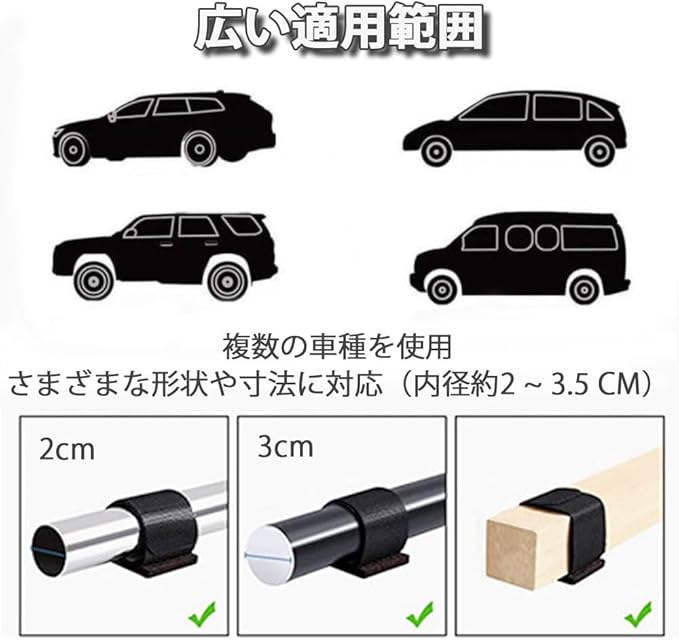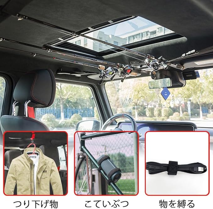 【適用シーン】車内での使用に最適で、車載釣竿や車載物干し竿の固定などが可能であり、その他の場面でも汎用可能である。