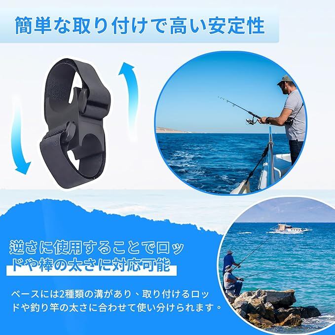 【取り付け&取り外し簡単】工具不要のマジックテープストラップ設計で、取り付けと取り外しが簡単です。長さを自由に調節可能で直径40mm以下の各種釣り竿及び横棒に対応できます。台座溝の幅さより細い竿先を固定する際は直接にバンドの隙間にはさめて固定が可能です。