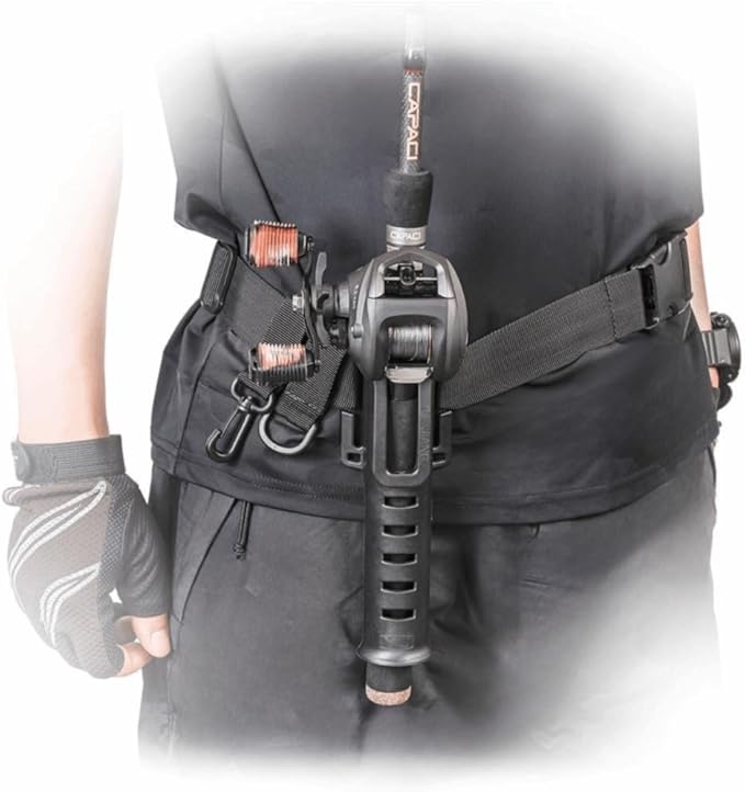 素早い装着と幅広い互換性:ウエストベルトは約 84~140cm に調整可能で、補強ステッチで重いロッドも安定サポート。レジャーから競技アングラーまで誰でも素早く装着可。