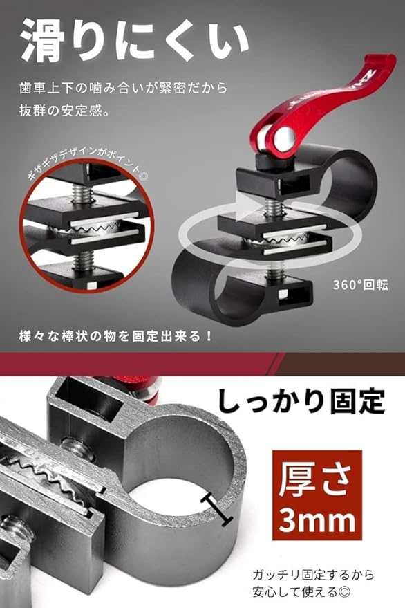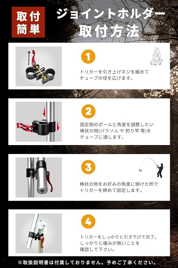 【注意事項】締付けしばらくした後に緩みが無いかをご確認ください。緩みがあるようですと増し締め等をお願いいたします。釣り等のレジャーの補助具としてご使用ください。強風時やその他、構造物の組み立て固定にはご使用されない様お願いいたします。