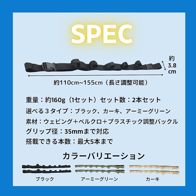【商品仕様】サイズ:約110cm~最長約155cm(調節可能) 素材:ウェビング+ベルクロ+プラスチック調整バックル グリップ径:約35mmまで対応 収納本数:最大5本のロッドを搭載可能 カラー:ブラック/カーキ/アーミーグリーン 対応車種:アシストグリップ付きの一般車(ワゴン、軽、SUV など) セット内容:ロッドホルダー1セット(2本)