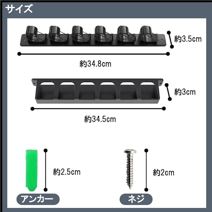 【省スペース・壁掛け収納】 本体幅はわずか約35cmのスリム設計。 玄関、クローゼット、ガレージなどの壁面に取り付け可能で、空きスペースを有効活用。 限られたスペースでもロッドをすっきり収納できます。