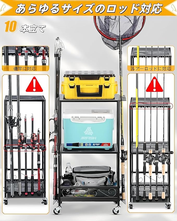【多様な釣り道具や収納ボックスに対応】Jumeiロッドスタンドは、3段の大容量設計を採用しており、さまざまな釣り道具や収納ボックスを簡単に収納できます。大型の釣り具から小さなアクセサリーまで、多くのアイテムをしっかりと整理できるため、釣り好きの方には欠かせないアイテムです。空間を最大限に活用し、必要なものをすぐに取り出せる便利な設計です。