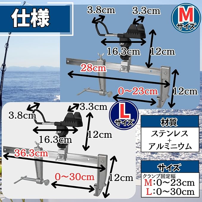 【耐久性と安心の設計】 本ロッドホルダーは、ステンレスとアルミを採用した頑丈な構造。耐錆性に優れ、潮風や海水にさらされる海釣りでも長期間安心して使用できます。樹脂パーツを適所に使用しており、竿本体を傷つける心配もありません。軽量設計ながら強度抜群で、23cmのMサイズと30cmのLサイズを用意。使用シーンやお手持ちの釣竿に合わせて選べるのも魅力です。また、工具不要で簡単に取り付けできるクランプ式を採用。ロッドキーパーとしての役割を果たしつつ、初心者からベテランまで誰でもすぐに使える手軽さもポイントです。