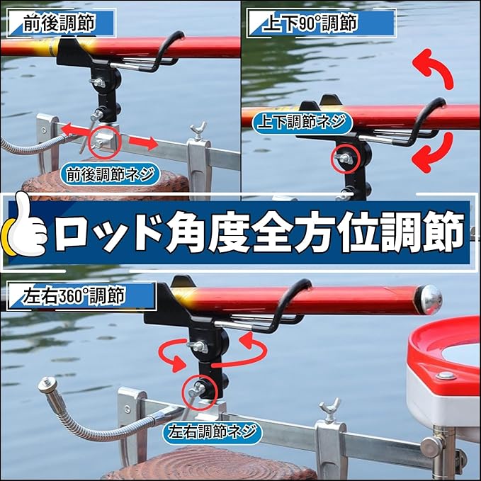 【調整可能で汎用性抜群】 釣り場や状況に応じて角度調整が可能なため、竿の位置を自由に変えられます。堤防釣りではしっかり固定して安定感を、船釣りでは揺れに対応した角度を確保するなど、場面ごとの最適なポジションで使用可能です。竿置きとしての基本機能はもちろん、細かい調整ができることで効率的にアタリを見逃さず、釣果アップにも直結します。クランプ幅が広めに設計されているため、厚みのある堤防や船の手すりにも取り付けやすく、まさに汎用性の高さが売り。釣竿の種類を選ばず幅広い釣り道具に対応できるので、これ一つであらゆるスタイルの釣りに対応できます。
