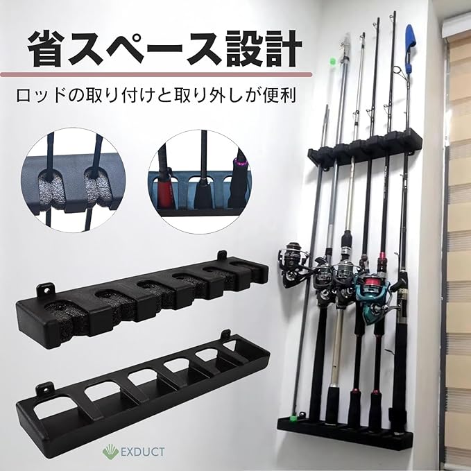 釣り竿をしっかり固定できるので散らばりにくくスペースを最大限に節約できます。固定部分は繰り返し固定できる素材なので簡単に取り付け、取り外しができます。