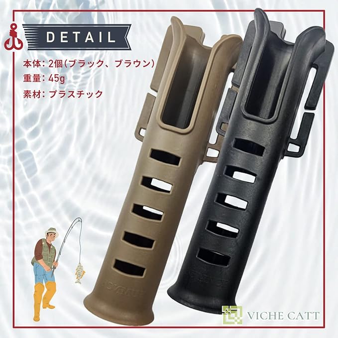 こちらのロッドホルダーは、お手持ちのベルトやフィッシングベストなどに簡単に取り付けることができ、高価なロッドを地面に直置きする事なく、ホルダーに刺したままルアーやフックの交換が行える優れものです。 両手が自由に使えるので荷物が多くなってしまう場面でも大変便利なアイテムとなっております。 ブラックとブラウンの2個セットなので、釣り場に合わせてベルトやベストを使い分けている方にもおすすめです。