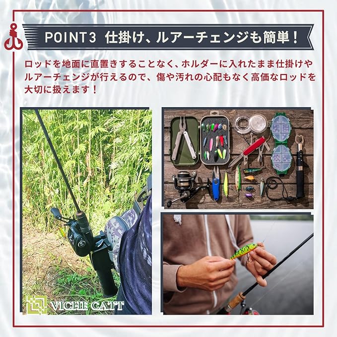 糸の結び変えやルアーチェンジを行う際にロッドホルダーを使うことで、スムーズな対応が可能となります。 また、ランガンスタイルをされる方にとっても、機動力が上がり、キャストを繰り返しながらの移動が可能となるため魚と出会える確立もグッと高まります。 こちらのロッドホルダーがあればあなたの釣行ライフをより快適なものにしてくれる事間違いなしです。