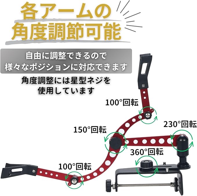 【竿受けの角度調整】 各アーム接続部に設置した角度調整ネジ(星型ネジ)により、竿置き角度を簡単に調整できます。※星型ネジドライバーは100均などで販売されています。ネジの凹幅が合えばマイナスドライバーでも使用できます。