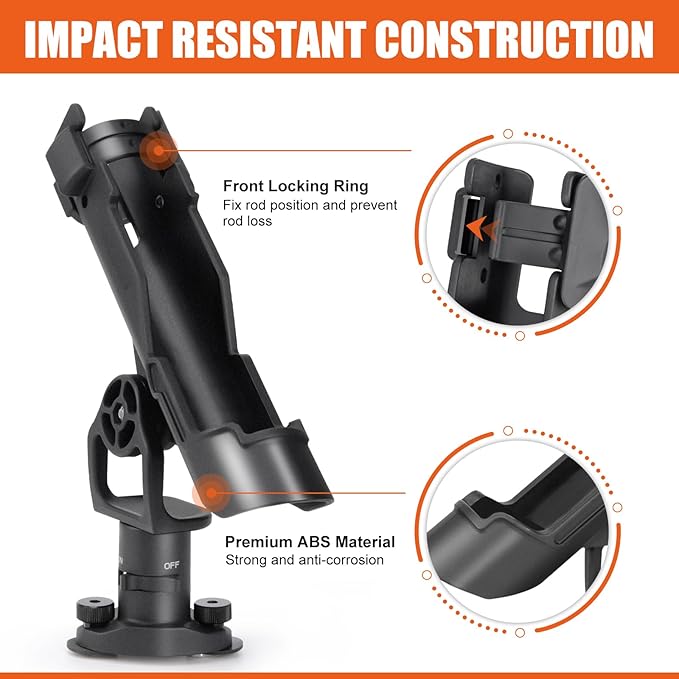 【ロッド固定機能】万能キャッチ設計であらゆるロッドとリールを保持。前方ロックリングで落下防止を実現。荒天時でも確実に動作。
