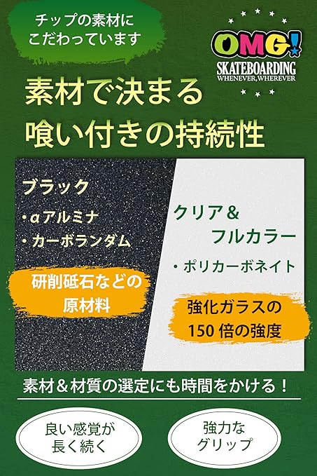 ✅【粘着剤】改良を重ねた強力な粘着剤は、寒暖差の大きい日本の夏の暑さと冬の寒さにも十分に対応し、プロスケーター達のハードなライディングでも剥がれにくい粘着力を持った最新のグルーを採用