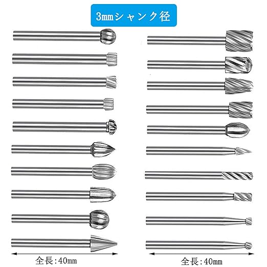 セット内容:20本リュータービット 、シャンク径:3mm 、 全長:40mm、材質:タングステン鋼、20種類セット ケース付。