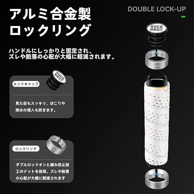 【アルミロックでしっかり固定】片側にアルミ合金製ロックリングと緩み防止(耐落)加工のナットを採用。ハンドルにしっかりと固定され、ズレや脱落の心配が大幅に軽減されます。付属の六角レンチで工具一本で簡単に取り付け可能。エンドキャップ付きで見た目もすっきりです。