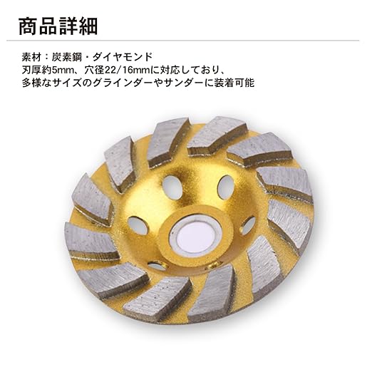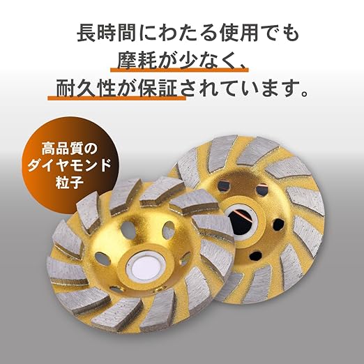 【高品質のダイヤモンド粒子を使用】ダイヤモンドカップサンダーは、コンクリートやモルタル、タイル、レンガ、瓦などの素材を効率よく磨くのに最適です。また、金属のバリ取りやガーデニングでの花壇整備など、さまざまな作業で威力を発揮します。高品質のダイヤモンド粒子を使用しており、長時間にわたる使用でも摩耗が少なく、耐久性が保証されています。